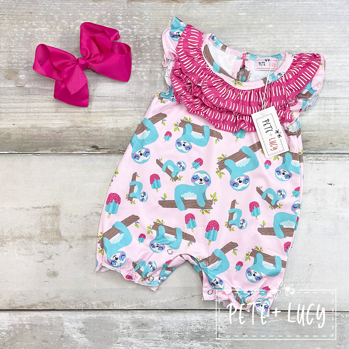 US branded children's clothing line offering trendy, affordable clothing sizes 0/3-11. Pete + Lucy produce base styles for girls including: Rompers, dresses, pant sets, short sets, and capris sets, in fun patterns that will only be printed in limited runs.